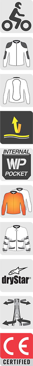 This suit is built to accept the Tech-Air® Street Airbag System, The vest, purchased separately, installs easily and does not require any external sensors to operate, Should it detect a crash, it will deploy a protective airbag, providing unrivaled protection to the rider's full back, shoulders, kidney area and chest, The garment is designed with stretch gussets on the arm and sleeves to accommodate the jacket’s inflated volume without compromising seam strength or material integrity, The jacket’s ergonomic design means that it can be worn without the airbag system for a versatile, personalized fit, LED display on sleeve indicating airbag’s operational status, while internal housing located in the built-in back protector accommodates the system vest’s ECU, Internal hook and loop grip closure fixings plus cable housing seamlessly accommodate the airbag system, Reflective graphic details and logos allow the ride to be more visible to other roads users in varying light conditions, Front waterproof cargo pockets offer greater convenience and a secure closure, Large, external utility pocket on lower back plus waterproof internal pockets and insert wallet pocket, Integrated soft edge collar and 3D mesh construction for enhanced comfort over long distances, Premium YKK zipper with double sliders for main front closure offer adaptable and secure convenience, Removable long-sleeve thermal liner ensures comfort on hot or cold days, Extra protective polymer layer in critical elbow and lower arm areas for superior abrasion resistance, Advanced reinforced poly-fabric textile and Alpinestars exclusive Drystar® waterproof and breathable construction for excellent all-weather performance, Internal impact protection provided by removable elbow and shoulder protectors, Chest and back pad compartments (Nucleon chest and back protector inserts available as accessory, sold separately) for use when Tech-Air Tech-Air® is not installed, Zippered chest air intakes and back exhaust ports for internal climate control and enhanced riding comfort, Pre-contoured sleeves with accordion stretch panels on elbows for improved riding performance, plus volume adjustment to ensure close fit, Hook-and-loop grip waist adjustment belt for highly customizable fit, External zippered pockets for safe and secure storage, Optimized for use with Alpinestars textile pants with internal waist connection zipper