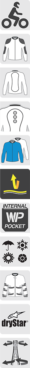 Multi-fabric shell construction with mesh panels on chest, back and sleeves for cooling performance, Removable waterproof and breathable Drystar® liner, Chest and back pad compartments with Polyethylene (PE) padding (Alpinestars Nucleon chest and back pads available as accessory upgrade, sold separately), Alpinestars Bio Air elbow and shoulder protectors, Multiple fit and volume adjusters, Convenient pockets, including a front inner waterproof pocket, Reflective details on sleeves