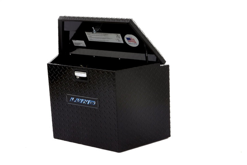 Trailer Tongue Boxes Constructed with heavy duty diamond tread aluminum, LUND's Trailer Tongue Boxes extend trailer usability by filling unused space with additional storage space for tools and equipment. These boxes are ideal for storing items such as: boat, personal water craft, equestrian, motorcycle and snowmobile accessories, as well as construction tools and equipment. The notched lids permit fully opening lids that can rest flush against trailer walls, allowing large items to easily be stored, while the strong 3 finger paddle handle offers easy single hand access. Each box features a secure locking double latch mechanism to ensure solid box closure, preventing accidental opening during transit, protecting expensive equipment and allowing application of padlocks.