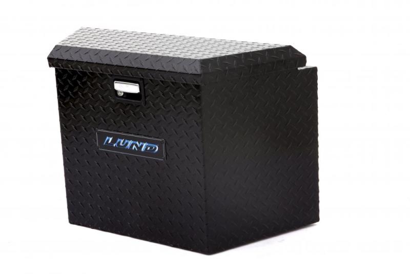Trailer Tongue Boxes Constructed with heavy duty diamond tread aluminum, LUND?s Trailer Tongue Boxes extend trailer usability by filling unused space with additional storage space for tools and equipment. These boxes are ideal for storing items such as: boat, personal water craft, equestrian, motorcycle and snowmobile accessories, as well as construction tools and equipment. The notched lids permit fully opening lids that can rest flush against trailer walls, allowing large items to easily be stored, while the strong 3 finger paddle handle offers easy single hand access. Each box features a secure locking double latch mechanism to ensure solid box closure, preventing accidental opening during transit, protecting expensive equipment and allowing application of padlocks.
