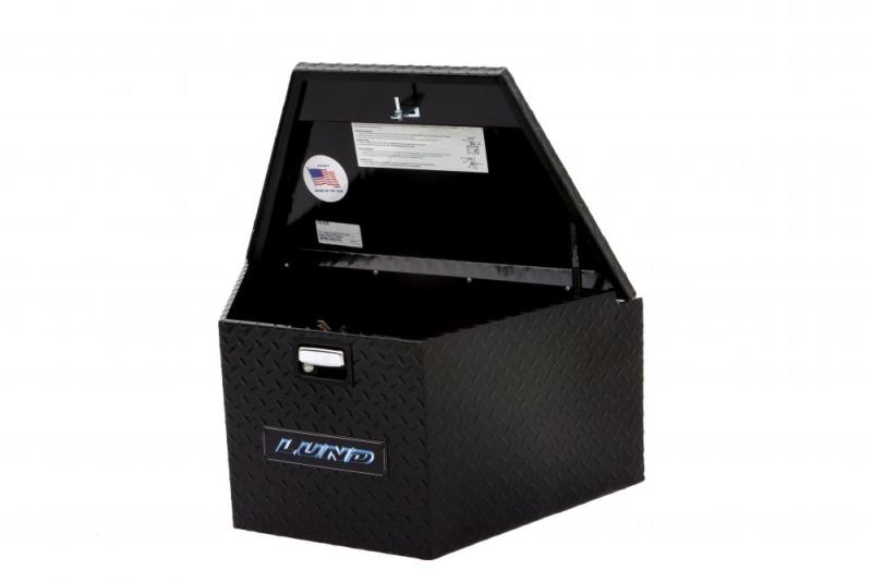 Trailer Tongue Boxes Constructed with heavy duty diamond tread aluminum, LUND?s Trailer Tongue Boxes extend trailer usability by filling unused space with additional storage space for tools and equipment. These boxes are ideal for storing items such as: boat, personal water craft, equestrian, motorcycle and snowmobile accessories, as well as construction tools and equipment. The notched lids permit fully opening lids that can rest flush against trailer walls, allowing large items to easily be stored, while the strong 3 finger paddle handle offers easy single hand access. Each box features a secure locking double latch mechanism to ensure solid box closure, preventing accidental opening during transit, protecting expensive equipment and allowing application of padlocks.
