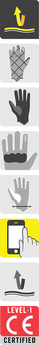Ergonomic stretch insert between thumb and palm offers flexibility to improve hand movement, Multi material main shell incorporating premium leather, soft-shell wind breaker on the backhand and stretch fabric, Rubber reinforcements with foam padding on thumb and palm for superior grip