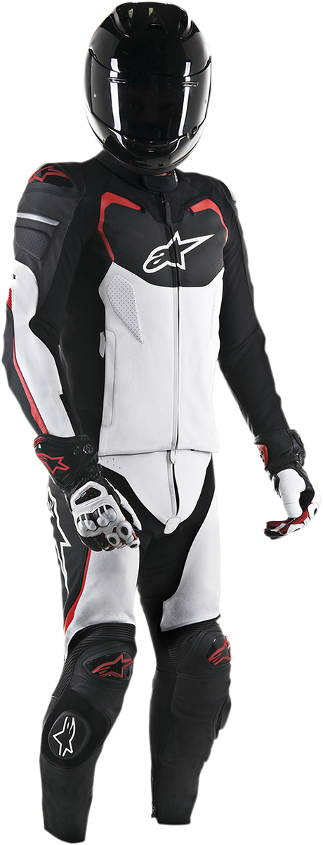 Constructed of premium 1.3mm full-grain leather, CE-certified protection on the shoulders, elbow, knee and tibia, Chest pad compartments with Polyethylene (PE) padding, (Alpinestars Bionic Chest Pads available as an accessory, sold separately), Multiple snap button system to integrate the Alpinestars Bionic Back Protector, External dual-density Thermoplastic Polyurethane (TPU) shoulder sliders are race tested, Advanced polyamide stretch panels on the sleeves, chest and crotch zones, High-density perforations on the chest and leg panels offer optimum cooling performance, Soft 3D mesh collar construction for breathability and comfort, Moto GP profile perforated back hump for improved aerodynamic and ventilation performance, Alpinestars-developed accordion leather back panel and knee inserts, Removable multi-panel lining incorporates 3D mesh inserts to improve comfort and ventilation, Inner thigh area includes textured, heat-stamped leather to promote good grip with the bike, Full-circumference waist zipper to securely fasten the suit together, D-ring waist adjustments with hook-and-loop straps, Replaceable Alpinestars Polyurethane (PU) Sport knee sliders