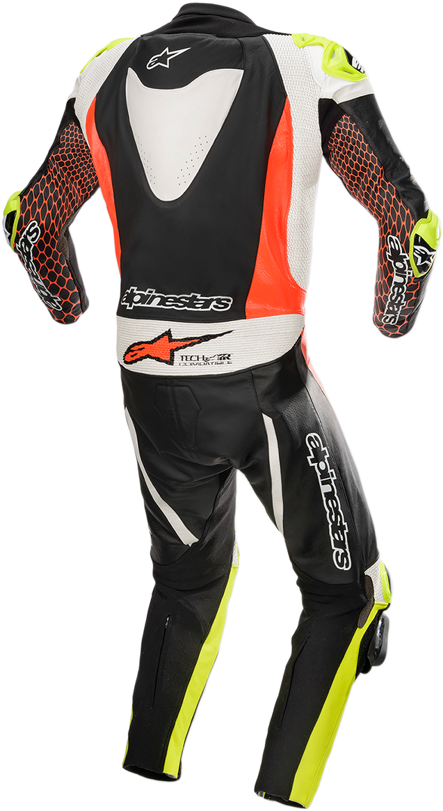 Racing leather suit designed with a body mapped race fit and pre-curved sleeves, legs and body for optimal riding performance, Tech-Air® compatible; Tech-Air® is the world’s first completely electronic, self-contained, full independent upper body motorcycle airbag system with no bike-to-rider set-up configurations required., An LED display on the sleeve indicates the airbag’s operational status, while an internal housing located in the back protector accommodates the system vest’s ECU, Strategically positioned accordion stretch panel inserts have been designed to accommodate Alpinestars airbag system, allowing expansion when the airbag inflates but also offering a high level of anatomical performance and a superior fit when riding without the system fitted, Kangaroo and bovine multi-panel construction for strength and flexibility., Patented leather bonded aramid grid panels placed in the most exposed areas which offer excellent additional resistance to tear and abrasion, and highly efficient insulation against the build-up of frictional heat, Hyper Resistant Stretch Fabric (HRSF) panels on the crotch, back of leg and underarms ensure lightness and high levels of flexibility and breathability, Perforated premium full-grain leather panels are strategically positioned to offer excellent levels of cooling airflow and comfort, Chest pad compartment designed to take the Nucleon chest pads, Comes fitted with the Nucleon hip protectors, Alpinestars race-derived, protectors on the elbow, shoulder, knee and tibia, Alpinestars new exclusive knee GP Dynamic Friction Shield (DFS) slider, with additional GP DFS on the shoulders, Innovative new RR elbow slider is anatomically contoured and features a removable and replaceable screw-mounted insert slider, Ergonomically designed AR (Abrasion Resistant) Shield reinforcement with aramid fiber and polyamide construction in the limb flexion zones to protect the exposed seams against abrasion., Removable inner stretch mesh liner with multi-panel construction and 3D textured fabric on the collar for comfort, Printed logos reduce weight and improve the flexibility of the leather, thus enhancing comfort and performance, Aerodynamic back hump is ventilated and designed to incorporate a hydration pack. Comes complete with an opening which can accommodate a hydration hose, Internal waterproof wallet pocket for peace-of-mind storage