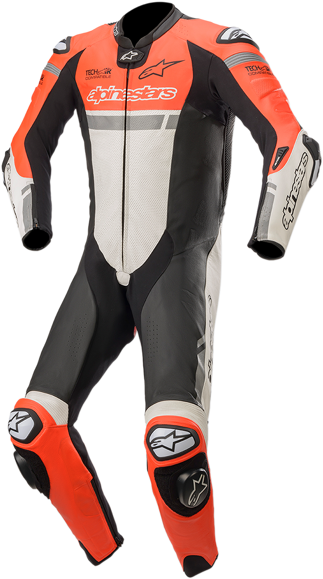 Tech-Air ® compatible, Premium leather main chassis constructed from 1.3mm genuine bovine leather, Large accordion stretch panels help movement and comfort on the bike, HRSF stretch fabric panels on sleeves, crotch further improve fit and feel, Ergonomic back hump, sculpted for better airflow and performance at high speed, Pre-curved sleeve and leg construction, Large perforated leather panels for maximum ventilation, Localized perforations highly improve ventilation, Printed graphic details, Calf expansion gusset, Integrated padding for increased comfort and protection, Chest pad compartments for Alpinestars Nucleon chest pads available as accessory upgrade, sold separately, Multi-layered knee construction reinforced with grip texture for optimal bike contact, Removable inner mesh liner for convenience and breathability, Inner waterproof wallet pocket, Comfort fabric on collar, Innovative new elbow slider is anatomically contoured and features a removable and replaceable screw-mounted insert slider, Dynamic Friction Shield (DFS) external dual density TPU sliders on shoulder and knee, Removable and replaceable Sport knee slider