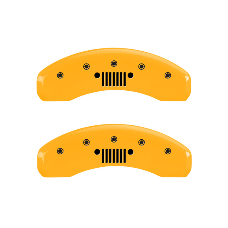 Set of 4 caliper covers, Engraved Front: JEEP - Engraved Rear: JEEP Grill logo, Yellow powder coat finish, black characters