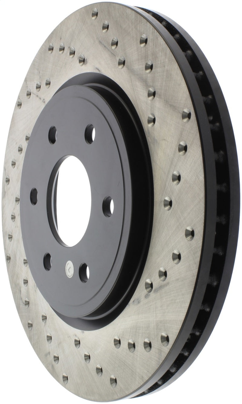 StopTech Drilled Sport Rotors are 1-piece direct replacement brake discs for factory brake systems and stock calipers that look great behind your wheels – and offer significantly improved braking performance. The unique cross-drilling aids with heat and brake dust dispersal, prevents glazing of the pads, adds bite and improves wet and dry braking performance. Built to last, the black e-coating provides protection from corrosion and the high carbon metallurgy (in most applications) offers quieter operation, better crack resistance and increased performance.