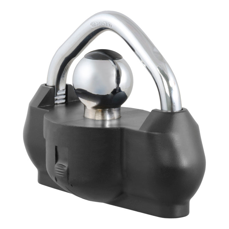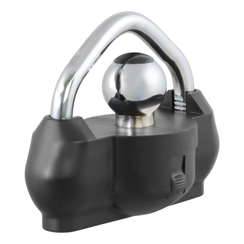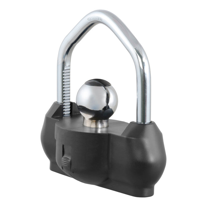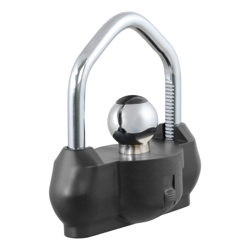 Sometimes a safety pin and coupler latch are just not enough to keep your toys safe. While CURT safety pins and coupler latches are made to keep your coupler securely latched onto your trailer ball, they are no substitute for the locking power provided by a CURT trailer lock. CURT trailer locks are designed to add security to your trailer and towing equipment. Instead of merely retaining the coupler latch mechanism, CURT trailer coupler locks are actually designed to protect your trailer from theft when it is not hitched up to your vehicle. This trailer lock features solid, hardened steel hardware and a ballistic-grade nylon body for a lasting strength and resistance to the elements. The dual-ratcheting locking system easily secures your trailer by inserting into the coupler and taking the place of a trailer ball. This CURT trailer lock is key-operated and features a universal fit to accommodate a variety of couplers. All CURT trailer locks include two keys in every package. Protect your boat, your camper and even your utility trailer the right way with a CURT coupler lock.