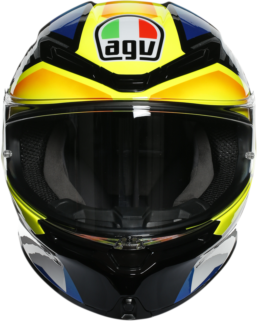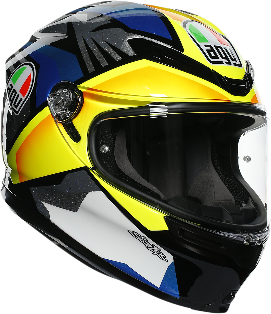 Carbon-Aramid fiber shell; collarbone safe profile with a shell shape designed to reduce turbulence, 5-density EPS, Adjustable air vents (5 front vents and 1 wide, rear extractor), Ritmo fabric cheek pads to facilitate putting on and taking off the helmet, with cheekbone area in Shalimar fabric to ensure stability at high speed, Shalimar fabric crown pad for a soft and gentle touch, Sanitized®: antibacterial protection, 2Dry: instant sweat absorption, Microsense: premium skin comfort, Embracing neck roll profile, Fit especially designed to allow wearing glasses, Cheek pads safety release system, Reflective inserts, All parts are easily removable and washable, Removable nose guard, Ready for AGV ARK communication system, Visor accomodates 190° horizontal and 85° vertical field of view, 4mm thick optic class 1 visor is anti-scratch and comes with a metal visor mechanism and multistep visor mechanism, 100% Max Vision Pinlock (120) included, Features Quick Release System and visor lock system, Micro-opening system, Double D retention system, Includes wind protector