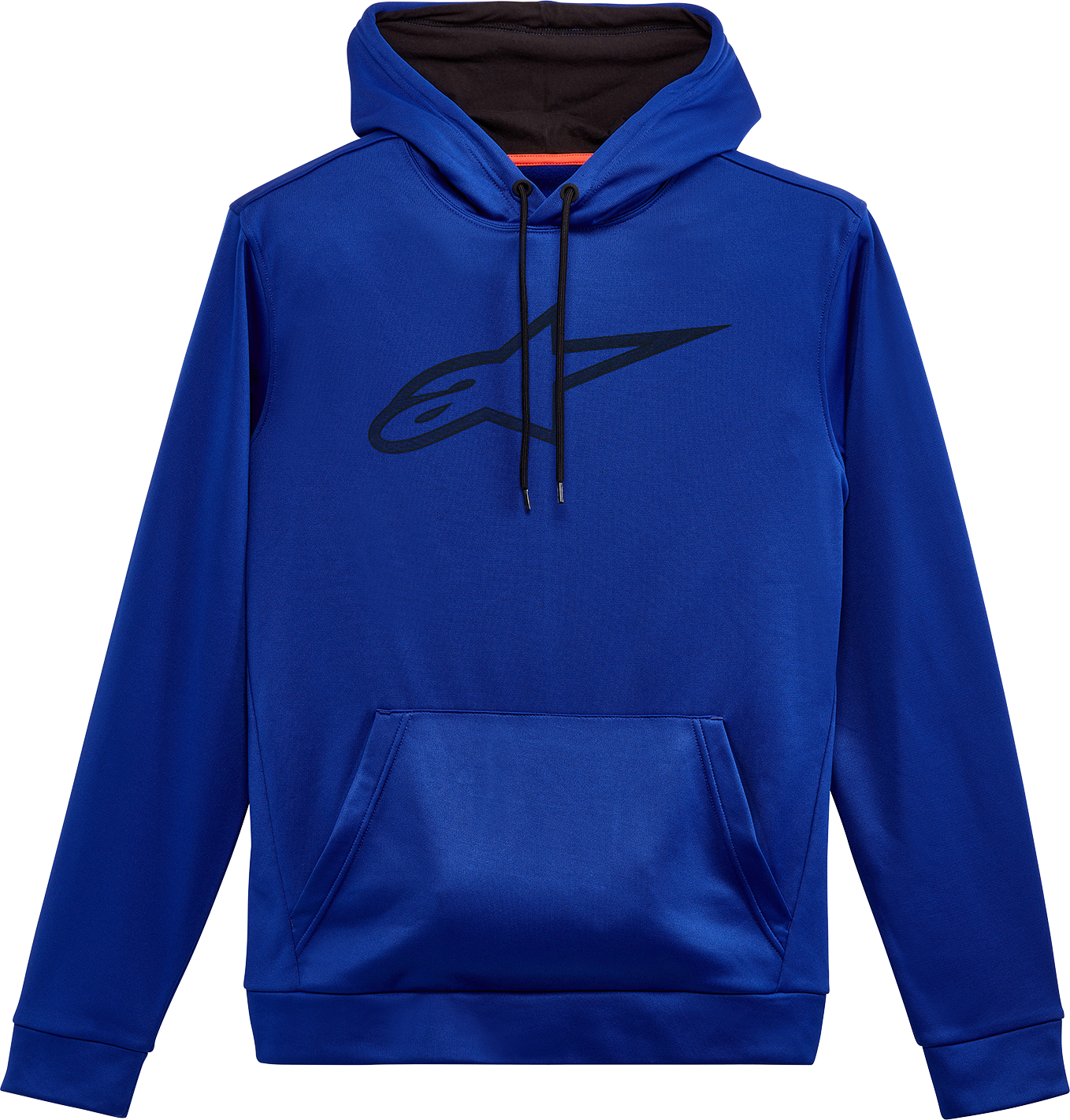 100% polyester brushed fleece, HD Alpinestars logo on front of pullover hoodie, Self cuffs and hem, lined hood and round draw cord, Internal main label and external label branding