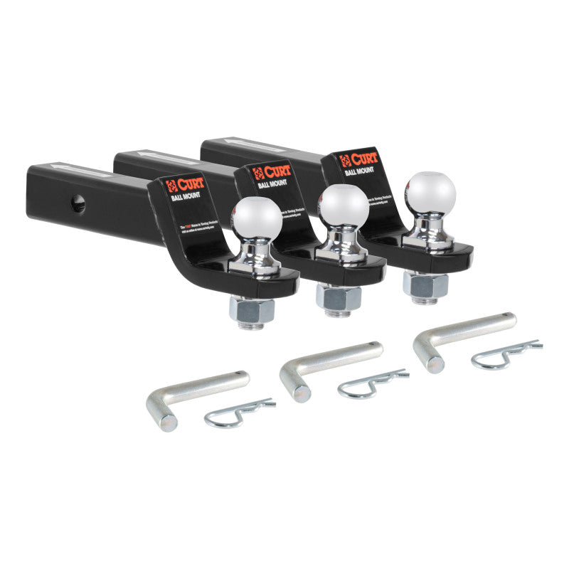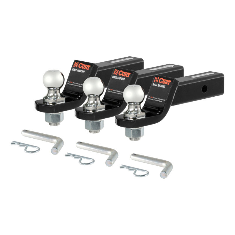 When it comes to ball mounts, a CURT loaded ball mount is the complete package. These stingers come with all necessary towing components and are pre-fitted with a factory-torqued trailer ball, eliminating the need to mount and torque your own trailer ball. This means a loaded ball mount is ready for towing right out of the package! Each one also comes with a pin and clip for mounting the ball mount into the appropriate size receiver tube. CURT offers loaded ball mounts in a variety of styles and weight ratings. This 3-pack of ball mounts includes three CURT loaded ball mounts, each with a gross trailer weight capacity of 3,500 lbs. and a tongue weight capacity of 350 lbs. They come with 1-7/8" trailer balls, making them an excellent choice for towing most small boat trailers, utility trailers, popup campers and some recreational vehicle trailers used for hauling dirt bikes, motorcycles and ATVs (NOTE: Never exceed the lowest weight capacity of any towing component; i.e. the vehicle, hitch, trailer, etc). These ball mounts also have a length of 8-1/4", a drop of 2" and come with a gloss black powder coat finish to resist rust, chipping and UV damage. All CURT loaded ball mounts feature 2" x 2" shanks and are made with the same superior quality we put into each of our products.