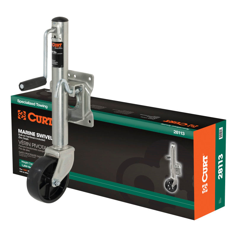 In our goal of being your best source for all things towing, the CURT line of trailer jacks is designed with care and manufactured with pride. CURT jacks are made with quality to promote the life and function of your trailer, and they come in several different styles to accommodate your needs, whether you are a frequenter of the boat landing, the campground, the racetrack or the field. Designed to withstand the wear and tear of frequent water exposure, CURT marine jacks are the jack of choice for the avid fisherman or boating enthusiast. Our marine jacks have a few features that make them a special addition to our trailer jack line. Unlike any of our other jacks, CURT marine trailer jacks are equipped with wheels, allowing for greater mobility and easier coupling of your trailer. Choose from models with one or two wheels. Marine jacks also have a heavy-duty pull-pin that allows them to pivot on their mounting bracket to be out of the way for travel. To protect them from corrosion and the damage of moisture, these jacks come with a zinc finish. This CURT marine jack features a weight capacity of 1,000 lbs., a travel of 10" and a wheel diameter of 6". It comes with a side-wind handle and all the necessary bolt-on hardware for a complete installation. It does not matter what kind of trailer you tow -- a boat trailer, utility trailer, livestock hauler or recreational vehicle trailer -- if you have a receiver-style trailer, you will want a jack that complements its function. For a trailer jack that will not steer you wrong, CURT has the answer.