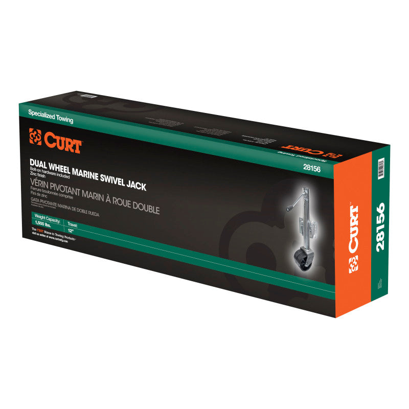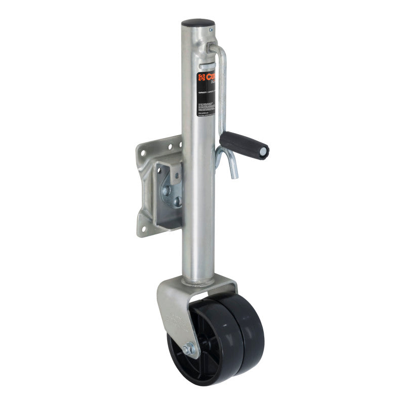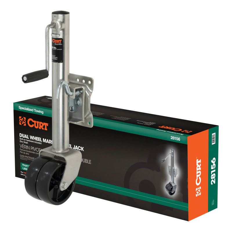 In our goal of being your best source for all things towing, the CURT line of trailer jacks is designed with care and manufactured with pride. CURT jacks are made with quality to promote the life and function of your trailer, and they come in several different styles to accommodate your needs, whether you are a frequenter of the boat landing, the campground, the racetrack or the field. Designed to withstand the wear and tear of frequent water exposure, CURT marine jacks are the jack of choice for the avid fisherman or boating enthusiast. Our marine jacks have a few features that make them a special addition to our trailer jack line. Unlike any of our other jacks, CURT marine trailer jacks are equipped with wheels, allowing for greater mobility and easier coupling of your trailer. Choose from models with one or two wheels. Marine jacks also have a heavy-duty pull-pin that allows them to pivot on their mounting bracket to be out of the way for travel. To protect them from corrosion and the damage of moisture, these jacks come with a zinc finish. This CURT marine jack features a weight capacity of 1,500 lbs., a travel of 10" and dual wheels with a 6" diameter. It comes with a side-wind handle and all the necessary bolt-on hardware for a complete installation. It does not matter what kind of trailer you tow -- a boat trailer, utility trailer, livestock hauler or recreational vehicle trailer -- if you have a receiver-style trailer, you will want a jack that complements its function. For a trailer jack that will not steer you wrong, CURT has the answer.