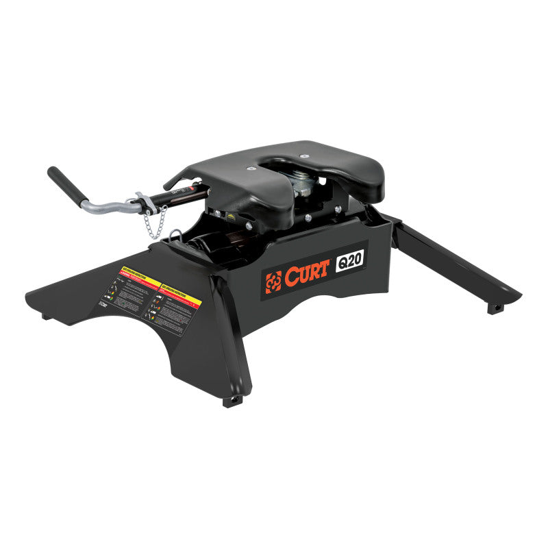 Like the other 5th wheel hitches of the CURT Q-Series, the CURT Q20 is a specialist in its class. It features a gross trailer weight capacity of 20,000 lbs. and can accept a vertical load limit of 5,000 lbs., giving it the capability to tow most large recreational vehicles, campers and many other 5th wheel trailers. Also like the Q24, the Q20 5th wheel has a superior hitch head, pivoting on a spherical axial bearing. This ensures smooth, quiet towing and allows unimpeded head movement and a wide turning radius for your trailer. The self-aligning head and dual-locking jaws make coupling easier, and with the three-position coupling mechanism, indicating when it safe to couple and when it is safe to tow, you can be out of the driveway and on your way quicker than ever. The Q20 comes with a durable carbide powder coat finish to give this hitch the best possible defense against corrosion, scratching, UV damage and whatever else you throw its way. It is tested in accordance with SAE J2638 for safety and is also backed by a limited lifetime warranty to give you peace of mind. This 20K 5th wheel hitch comes with a set of standard 5th wheel legs that are ready to mount into your truck bed with a pair 5th wheel rails and brackets (base rails and brackets sold separately).