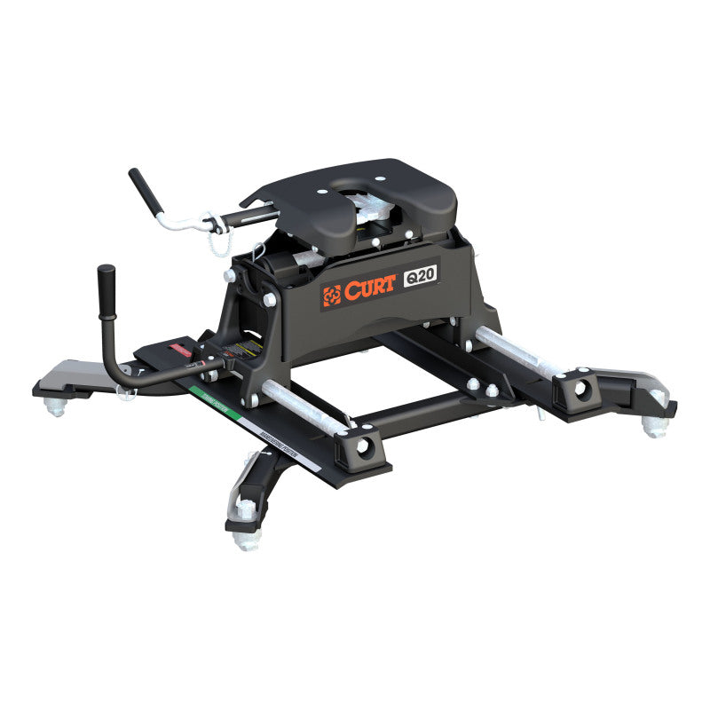 Like the other 5th wheel hitches of the CURT Q-series, the CURT Q20 is designed to offer the quietest 5th wheel towing possible. It does this using a spherical axial bearing. This unique pivoting mechanism is built into the hitch head and allows it to tilt with the 5th wheel trailer in any direction necessary. With its dual-locking jaws for 360-degree pin contact and three grease fittings for continuous lubrication, the spherical axial bearing provides smooth, safe, quiet towing, even with large 5th wheel trailers. The Q20 also makes the coupling process easier. It features a self-aligning head to help reduce errors when backing up to the kingpin, as well as a three-position coupling indicator that is visible from the truck cab, eliminating the need to get out of the vehicle to check the connection. This 20K 5th wheel hitch comes with the CURT R20 roller and the CURT OEM puck system 5th wheel roller adapter. It is designed to be mounted on a Ram short-bed pickup with the truck bed puck system. Using a set of quarter-turn anchors, the adapter quickly and easily drop into the pucks, instantly mounting the Q20 hitch and roller and equipping the truck for 5th wheel towing. Once installed, the R20 roller allows for added clearance when making tight turns with your trailer. CURT 5th wheel rollers are true rolling units, meaning they actually roll on wheels that bear the weight of the trailer rather than simply sliding on hollow rods as seen in competitive models. With a thick operating handle, the roller smoothly rolls the 5th wheel head forward and back, locking securely into each position as desired. CURT rollers also provide up to 12" of displacement as well, unlike the more common 10", to give you a wide range of motion and plenty of space to get your RV or other 5th wheel trailer around any turn. This Q20 hitch with puck system roller is only intended to fit the Ram puck system and cannot be installed without it.
