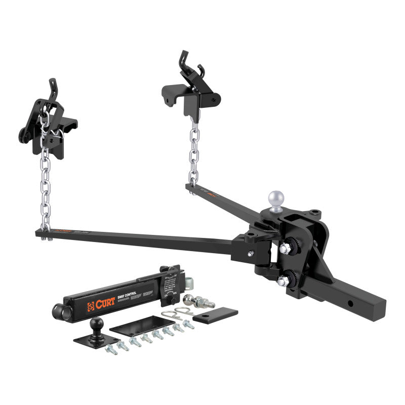 The CURT weight distribution hitch is a specialized towing system that provides improved vehicle and trailer control by leveling the trailer and more evenly distributing its tongue weight across the trailer's and vehicle's axles. Weight distribution hitches are commonly used on travel trailers and campers but can also be applied to other large loads. CURT WD hitches come with a 2" x 2" shank and are compatible with class 3, 4 and most 5 trailer hitches, including Xtra Duty and Commercial Duty (2-1/2" replacement WD shank may be required), as well as some RV trailer hitches. While a weight distribution hitch will increase the gross trailer weight capacity of most trailer hitches, the vehicle's weight carrying capacity must be taken into consideration before towing a heavier trailer (NOTE: Never exceed the lowest weight capacity of any towing component).This trunnion bar weight distribution hitch features a heavy-duty formed head and square spring bars constructed from forged steel. It offers a gross trailer weight capacity up to 15,000 lbs. and a tongue weight capacity of 1,500 lbs. It also includes hook-up brackets, spring bar safety chains, a trailer ball and a pin and clip. To protect this hitch from scratching, chipping, rust and UV damage, it also comes with a durable black powder coat finish. For added sway control, this weight distribution hitch includes a sway control unit. While weight distribution hitches are an effective solution for stabilizing and leveling out your towing rig, they should not be considered a sway control. However, when combined with a CURT sway control kit, the WD hitch maximizes its effectiveness in controlling sway. The sway control kit includes a sway control unit, trailer balls to attach to the trailer and hitch, a reinforcement plate and attachment clips.