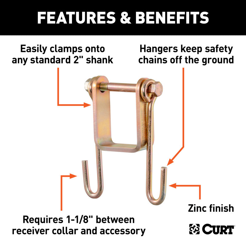 The CURT trailer safety chain hanger bracket saves your trailer chains from scraping and dragging on the ground. It quickly and securely bolts onto a 2-inch hitch shank and provides two steel hooks to hang the safety chains up off the ground when connected to the vehicle. The hanger hooks also maintain proper safety chain function in the event of a vehicle-trailer disconnect. Installing this safety chain hanger bracket is simple. Just bolt it onto the shank of your existing 2-inch x 2-inch ball mount (1-1/8-inch clearance required between mount and hitch receiver tube). Unlike other hanger options, this bracket clamps into place and will not get lost or dropped like temporary models. CURT trailer safety chain hangers are constructed from steel and are shielded with a corrosion-resistant zinc finish. NOTE: Hangers are meant to serve as an intermediate connection only. Always connect your safety chains to proper safety chain loops on the vehicle.