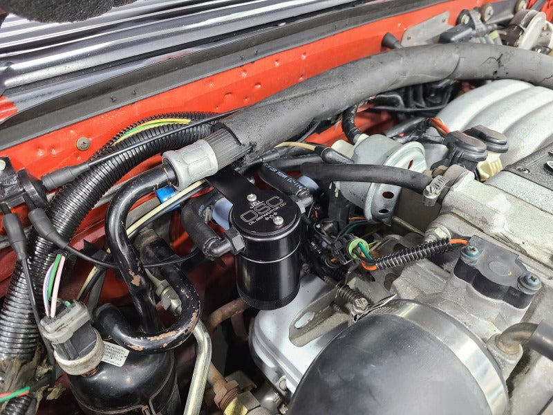 During the process of venting crankcase pressure back through your intake track, large amounts of oil, in the form of vapors can gather/accumulate in your intake tube, intake manifold runners and even dilute your gas, lowering its octane level. This happens on all engines and is even worse with forced inducted vehicles (supercharged and turbocharged) as crankcase pressures are increased. To combat this, we have developed an oil separator of our own design. Milled from solid billet aluminum this is a rock-solid piece. It has a knurled tank base for easy removal to drain the spent oil and an O-ring seal to prevent any leaks.