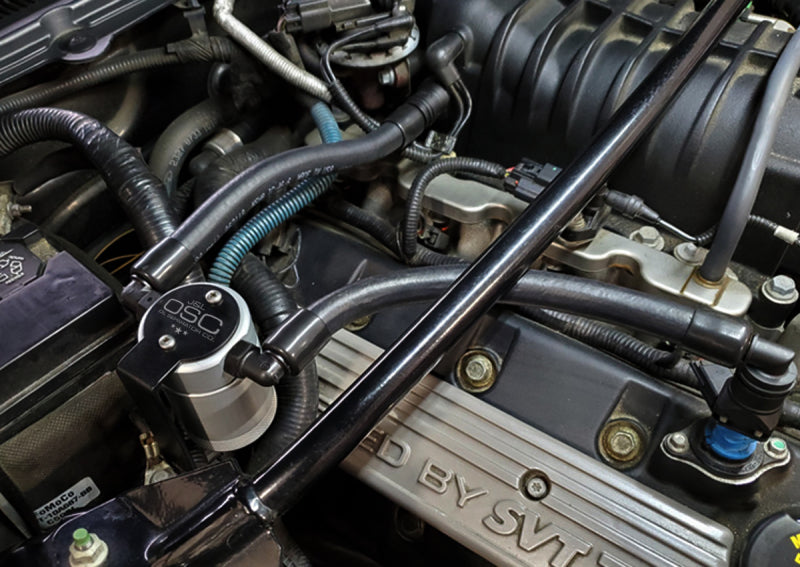 During the process of venting crankcase pressure back through your intake track, large amounts of oil, in the form of vapors can gather/accumulate in your intake tube, intake manifold runners and even dilute your gas, lowering its octane level. This happens on all engines and is even worse with forced inducted vehicles (supercharged and turbocharged) as crankcase pressures are increased. To combat this, we have developed an oil separator of our own design. Milled from solid billet aluminum this is a rock-solid piece. It has a knurled tank base for easy removal to drain the spent oil and an O-ring seal to prevent any leaks.