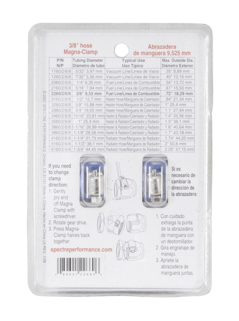 Spectre Magna-Clamps 2266 are designed to fit 3/8 inch inside diameter as well as AN-8 vacuum and fuel hoses that have a maximum outside diameter of 0.725 inches including any covering. The stainless steel gear drive clamps feature a two-piece blue anodized aluminum housing that provides secure tightening at an affordable price. Included are 2 Magna-Clamps that are designed to perform as well as they look, the magna clamps are ideal for race, street, and show.