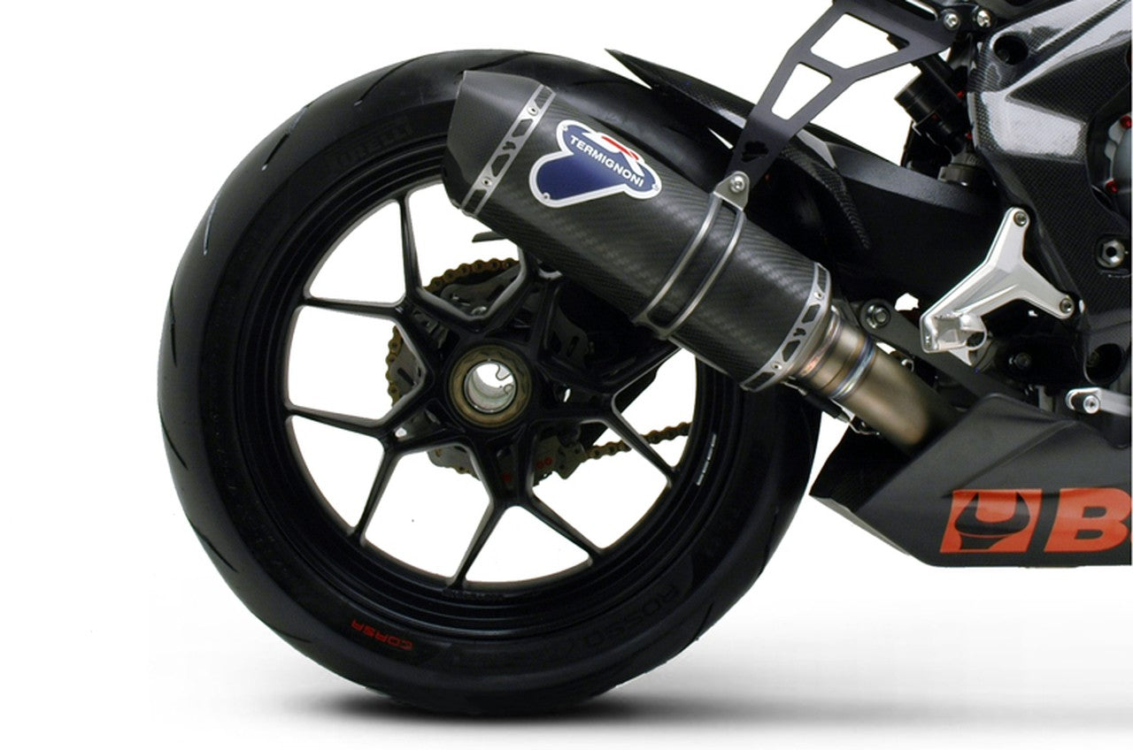 The exhaust is characterized by a main structure in titanium with a carbon fiber sleeve and rear cap.