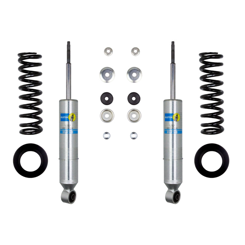 Designed for the serious off-road adventure seeker, the all new Bilstein B8 6112 kit is the ultimate suspension solution. The Bilstein B8 6112 kit optimizes off-road and on-road capabilities with a 60mm digressive piston for increased damping control. This kit features specially designed cold wound springs and an adjustable spring seat which allows for vehicle leveling, larger tires, and increased ground clearance. The kit comes with (2) 60mm shock absorbers (2) springs and (2) billet spring seats. Bilstein B8 6112 kits are a direct bolt on for late model half-ton trucks and SUVs which utilize a front factory coilover suspension design. The Bilstein B8 6112 kit is for front applications and reuses the OEM top mount and spring isolators. To maximize performance, Bilstein recommends a B8 5160 remote reservoir shock absorber for the rear application.