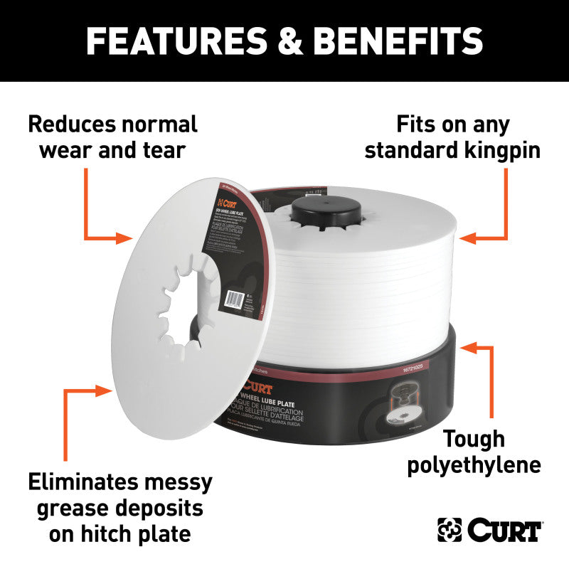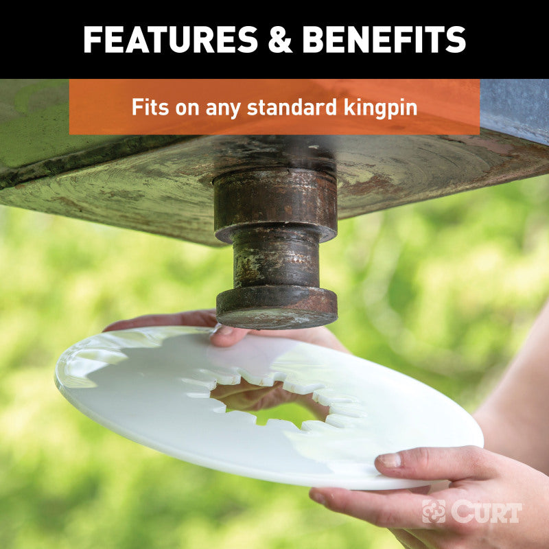 The grand lifestyle that goes hand in hand with 5th wheel towing is made perfect in the details. You can talk all you want about whose RV hogs the most road or whose 5th wheel hitch can handle the most tonnage, but when you get down to it, the best hitch and trailer setup in the world can never reach its full potential without the right accessories to back it up. Protect your 5th wheel hitch and 5th wheel trailer with a CURT lube plate. These 10" discs easily slide onto the kingpin of your 5th wheel trailer, eliminating messy grease deposits and reducing normal wear and tear when towing with your 5th wheel.