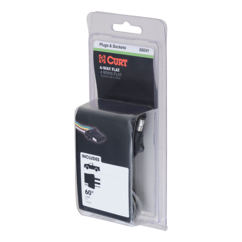 Like trailer hitches and ball mounts, electrical connectors range all over the board in shape, size and capability, but no matter what your trailer's electrical functions are, you need a solid connection to keep the power flowing and ensure safety on the road. CURT electrical connectors are designed and manufactured to give you a reliable connection every time you plug in your trailer. This 4-way flat connector is designed to supply power for tail lights, turn signals and brake lights, as well as a ground connection. It features durable rubber-molded construction and is made with 60" of standard color-coded, bonded wire to easily splice into your vehicle's wiring system. This 4-way flat connector is a female-end socket, specifically designed for the car side of the connection. It is compatible with all 2-wire vehicle systems.