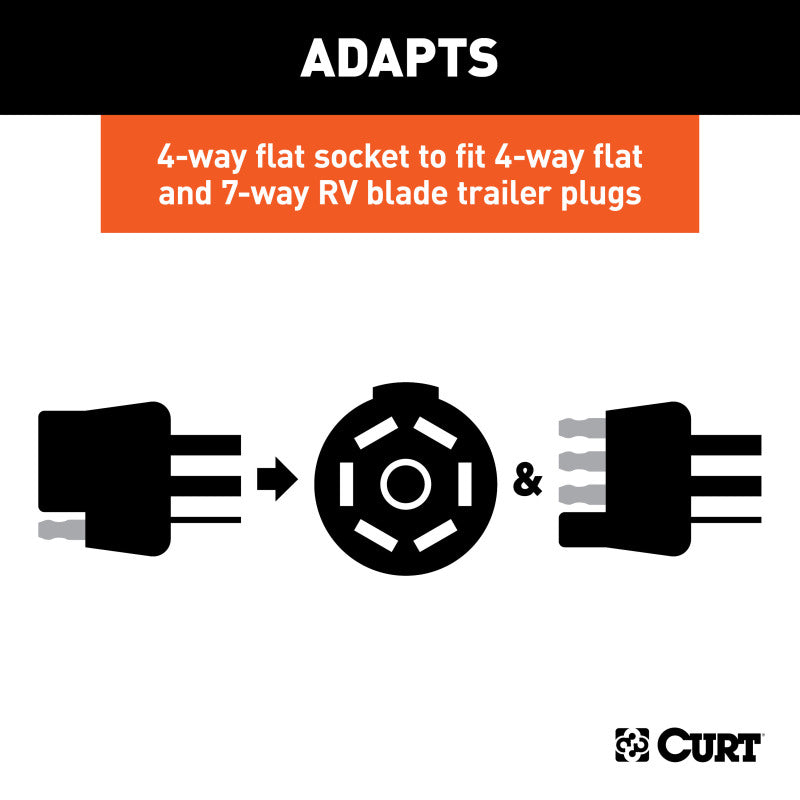 There are several different types of connectors used to supply power from a tow vehicle's electrical system to a trailer's wiring system. Some trailers only need the bare essentials -- running lights, brake lights and turn signals -- while others require a connection for reverse lights, electric brakes and auxiliary power. With connectors ranging from simple to complex, it may be the case that the connection between your vehicle and your trailer is not a perfect match. For example, your truck may be equipped with a 6-way round socket, but your trailer may have a 4-way flat plug. For this very common problem, CURT offers a quick and simple solution in the form of an electrical adapter. An adapter is an electrical device that allows a connection to be made between a mismatched trailer plug and vehicle socket. It easily plugs in your vehicle's electrical socket and usually requires no additional wiring. CURT offers an array of adapters to accommodate most types of plugs and sockets, including 4-way flat, 4-way round, 5-way flat, 6-way round, 7-way RV blades and more. This special electrical adapter is actually designed to adapt a 4-way flat vehicle socket to fit multiple trailer plugs, including a 4-way flat and a 7-way RV blade. Some manual wiring is required. This multipurpose socket also comes with its own backup alarm, dust covers, a mounting bracket and all necessary mounting hardware for a complete installation. All CURT wiring and electrical products come with a one-year limited warranty to give you the assurance you need to tow with confidence.