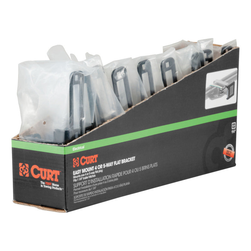 CURT electrical connector brackets provide a simple solution for mounting wiring to your trailer hitch or the rear of your vehicle. Connector wires can be a nuisance when they are just lying around. They can get tangled up with cargo and even damaged. An electrical connector left to hang off the back end of your vehicle is an even greater hazard. Secure, protect and optimize the use of your electrical connector by mounting it with a CURT connector bracket.CURT Easy-Mount electrical brackets are an especially convenient option for mounting your connector wiring to your trailer hitch. They mount over the opening of the receiver tube and are held secure using a set of independent screws, meaning there is no drilling or clamping required. Easy-Mount brackets feature solid steel construction, so they will not crack or break like competitive products, and they have a notched design to allow easy access to the receiver hitch pin and clip. These particular CURT Easy-Mount electrical brackets are designed to fit over a 1-1/4" x 1-1/4" receiver tube opening and provide a sturdy mounting place, right beside your trailer hitch receiver, for a 4-way or 5-way flat connector. This multi-pack includes 10 Easy-Mount brackets.When it comes to plugging in your trailer lights, it pays not to skimp out. CURT electrical is the smart way to ensure that your trailer lights and electrical systems are prepared for the road ahead. Keep the power flowing, no matter where your adventures take you, with quality electrical products from CURT.