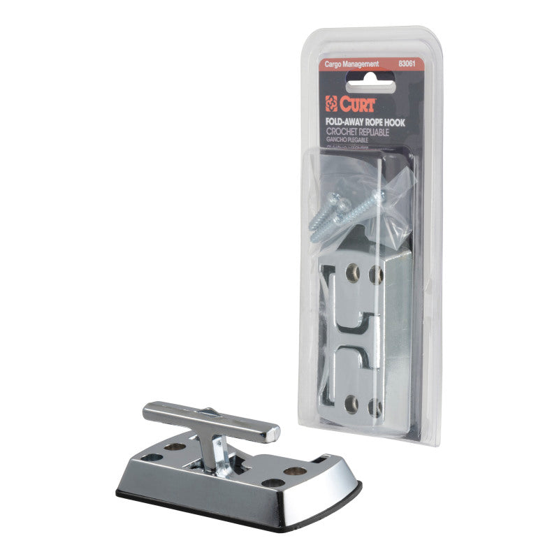 Making sure that your cargo is tied down and fully secure for the journey is important for any towing job. Not only is unsecured cargo a danger to you, your passengers and your fellow drivers, but it can also cause damage to your trailer, pickup truck bed or vehicle cargo area, as well as to the cargo itself. Together with our cargo straps and safety chains, CURT tiedown anchors are easy to mount in any trailer, truck or full-size van, and they help keep your items safe for the road ahead. This particular tiedown anchor is a fold-away rope hook, designed to add a convenient anchoring point for ropes or cords. The folding feature allows it to remain flush with the base and out of the way when not in use, making it especially useful for truck beds and passenger vehicles. This rope hook features a chrome-plated finish and offers a capacity of 1,200 lbs. It can be mounted on various surfaces and includes all necessary hardware for a complete installation.
