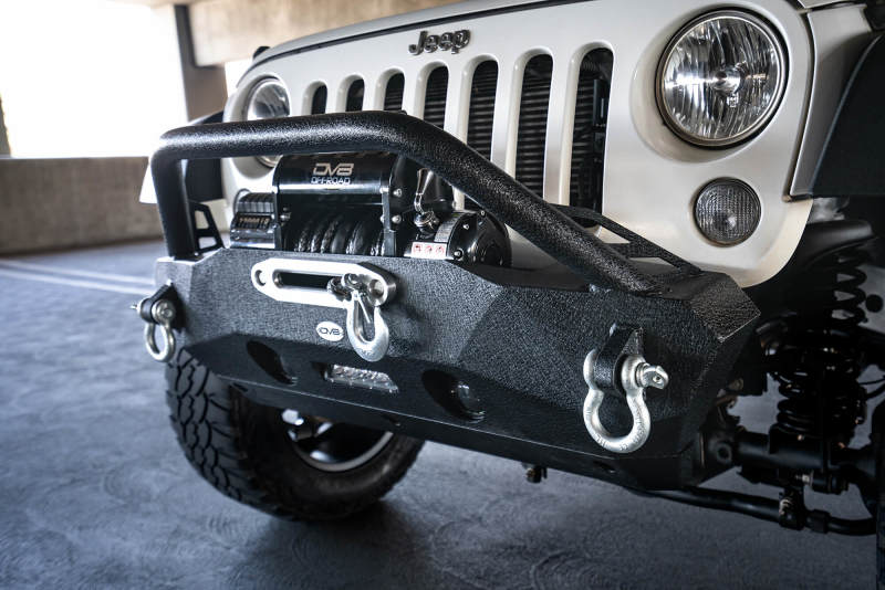DV8 Off Road Hammer Forged Jeep Front Bumpers were designed and built with hardcore wheeling in mind. Inspired by King of the Hammers style racing and crawling these bumpers are designed to perform on the rocks where you need protection the most. All of our Hammer Forged front bumpers have heavily reinforced winch plates, 2 shackle recovery points, great approach angles, and are made of thick, high tensile strength steel.
