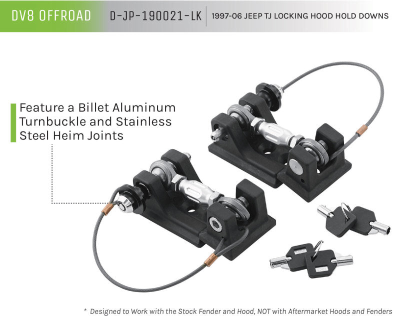 Ever drive down the road and notice a little flutter in your Jeep's hood? Have you replaced the stock, rubber hood hold downs that came with your Jeep? DV8's race-inspired, lockable hood hold downs feature a billet aluminum turnbuckle and stainless steel heim joints and prevent any unwanted, underhood tampering or theft when you're away from your Jeep. The quick-release push pin provides easy access to opening your hood and won't be lost thanks to the attached, stainless steel lanyard. NOTE: Designed to work with the stock fender and hood - may not work with all aftermarket hoods, fenders and fender flairs.