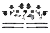 This high quality system has been designed to retain the factory load carrying capacity and ride of the vehicle with minimal parts. The factory Ram Radius Arms are relocated with heavy duty 1/4? thick steel brackets for proper caster with the 5" lift. Super stout front and rear Track Bar drop brackets center the axles under the vehicle with the new ride height. The stock coil springs are retained with angular steel spacers to retain the factory front spring bow. This is an important feature with the stock springs as Chrysler designed the bow to aid in their unique alignment specs and ride. Flat spacers do not provide this. The rear coil springs are also retained with steel spacers keeping the weight carrying capacity of the vehicle intact. A Fabtech innovation with this Ram lift kit is the heavy duty steel front bump extensions. They retain the stock bump stop cushions for progressive damping and will not allow the suspension to over travel. This is a superior feature compared to replacement long length urethane bump stops as they can push out under harsh conditions and allow over traveling. FEATURES: Retains factory coil springs for proper handling and load carrying capacity. Heavy duty Radius Arm drop brackets provide proper caster for the increased ride height. 1/4" thick steel bracket construction throughout for added strength. Includes Free 5 year 60,000 mile Powertrain warranty. FRONT ANGLED COIL SPACERS: Heavy duty 1/4" thick steel spacers retain the factory springs and seat angle for proper preload bow of the springs as Chrysler designed it. REAR COIL SPRING SPACERS: Fabricated 1/4" thick steel spacers provide lift with the stock rear coil springs retaining the factory load carrying capacity and ride quality. TRACK BAR BRACKETS ? FRONT AND REAR: 1/4" thick steel bracketry re-positions the factory track bars to center the axles under the vehicle with the increased lift height. Super stout box style brackets are designed to eliminate deflection w