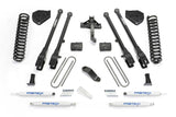 Fabtech?s 6" 4 Link Conversion system for the Ford F450 and F550 Super Duty is built to handle the on and offroad demands of the truck enthusiast. This vehicle?s suspension is more robust than the Ford F250 and F350 and therefore demands specialty parts only available from Fabtech. This system comes with everything needed to convert to a 4 Link front suspension. The system will provide less caster change throughout the travel range which benefits on road driving. Offroad the 4 Link system will provide more articulation than a Radius Arm for increased terrain traversing at all speeds. Fabtech?s 4 Link System has been proven in over 10 years of service in consumer, commercial and military applications. High quality components with properly design suspension geometry is the pinnacle of Super Duty suspension systems. Each Fabtech component is expertly built in house and has specific design features and benefits as listed below. FEATURES: LINK ARMS & BRACKETS - 2" OD Heavy wall link arms have 1/4" thick steel brackets at the axle with adjustable alignment cams and Fabtech?s legendary 5 Ton joints? to pivot at the frame for an extended service life. The 5 Ton joints? have been proven in military use for over 10 years and are quiet and strong. The 4 Link Arms attach to stout 1/4" thick steel frame brackets for a solid mounting of the new suspension. The geometry of the 4 Link arms and frame brackets has been designed to provide an improved highway ride due to reduced caster change and able to tackle rough offroad conditions better than a Radius Arm suspension. COIL SPRINGS - American made coil springs have been designed for a very compliant ride quality both on and offroad. Each coil is preset during the manufacturing process to insure no ride height settling over time. Allows for a 2" increase in wheel travel over stock when used with Fabtech shock absorbers. TRACK BAR BRACKET - 1/4" thick steel bracketry rep-ositions the factory track bar to center the axle under
